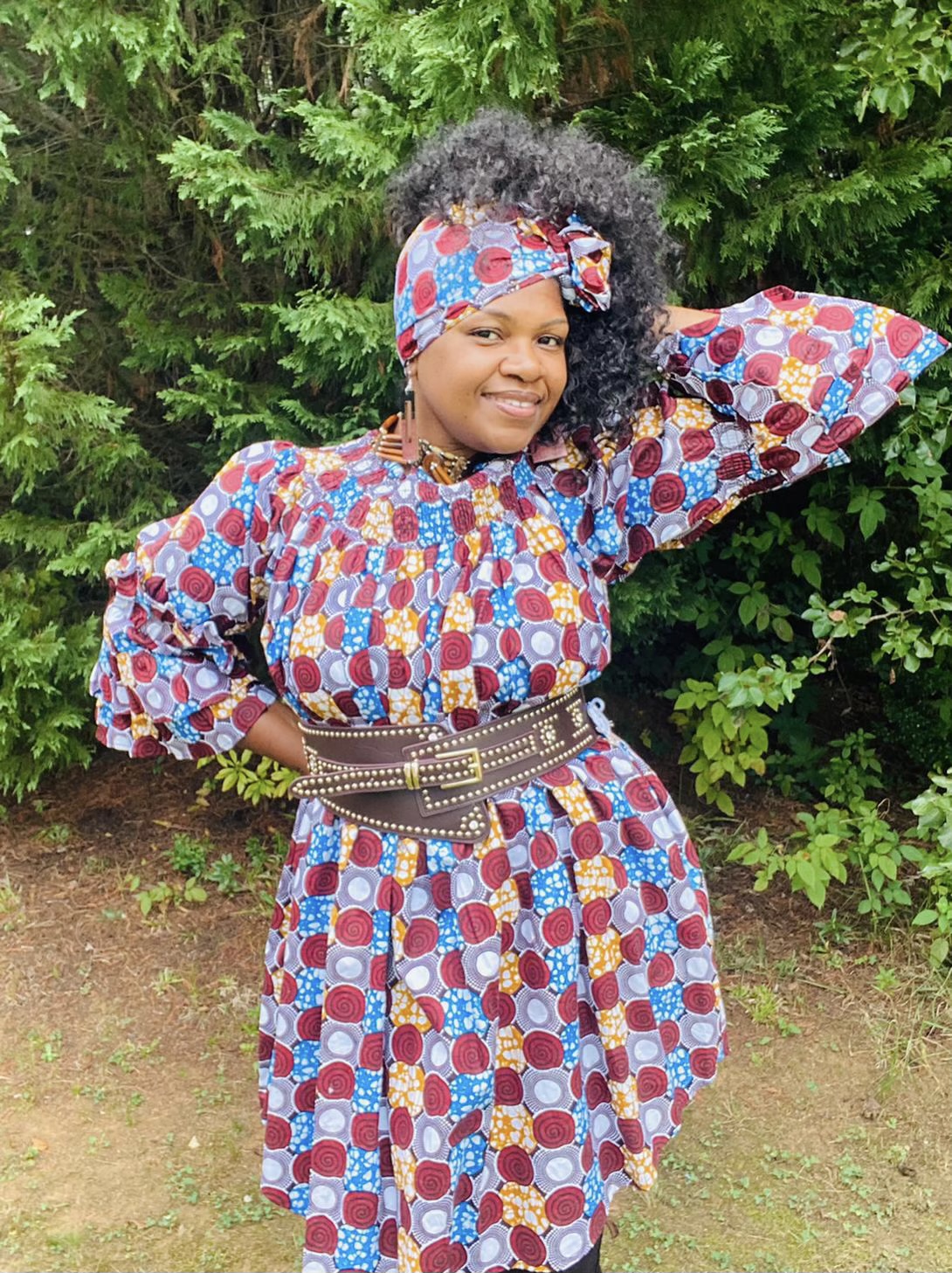 Ruffled Sleeve Knee length Shirt Dress w/ Belt & Headwrap