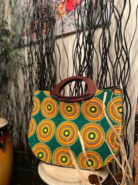 Discover our stylish Ghanaian handbag, crafted from authentic African fabric and leather, with a unique sankofa bird wooden handle. This exquisite piece blends cultural heritage with modern fashion, perfect for any occasion.