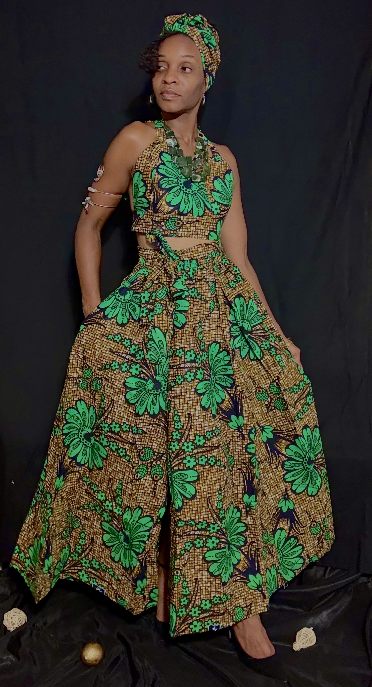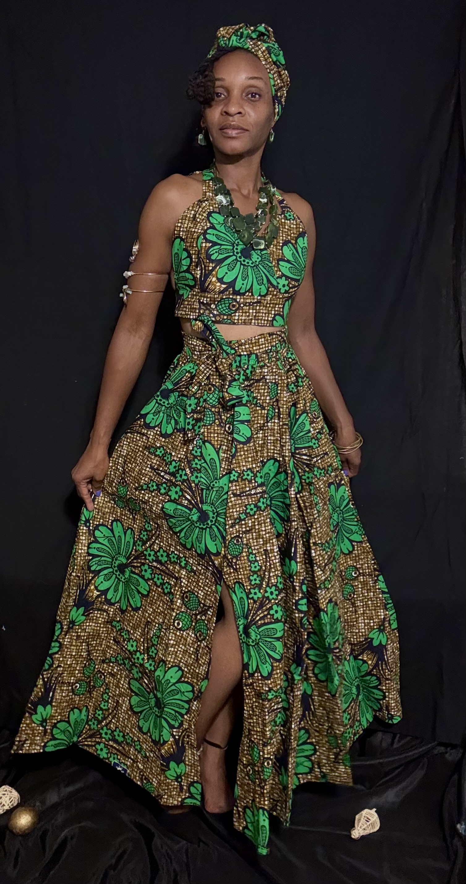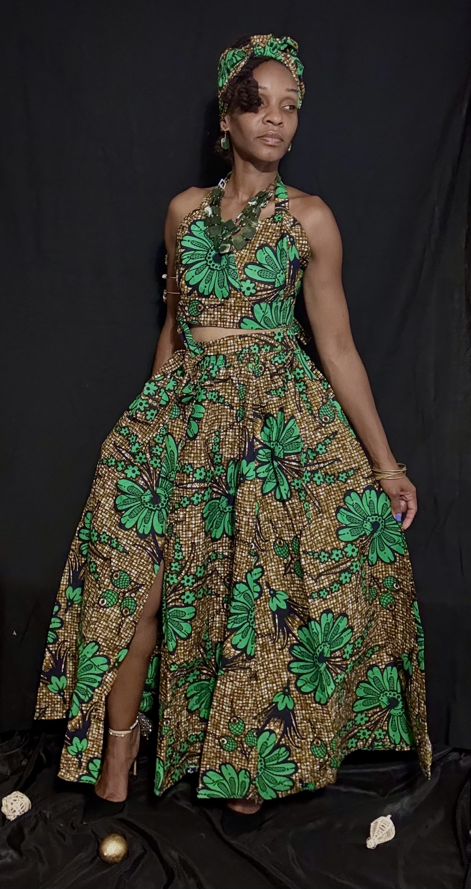 Elevate your style with our stunning "Bold Beauty" skirt set, inspired by traditional African prints. This eye-catching ensemble features a flowing maxi skirt and a matching halter top, both adorned with a vibrant green and gold floral pattern. Perfect for making a statement at any occasion, this outfit is sure to turn heads. Pair it with gold accessories and a bold smile for a look that's truly unforgettable.