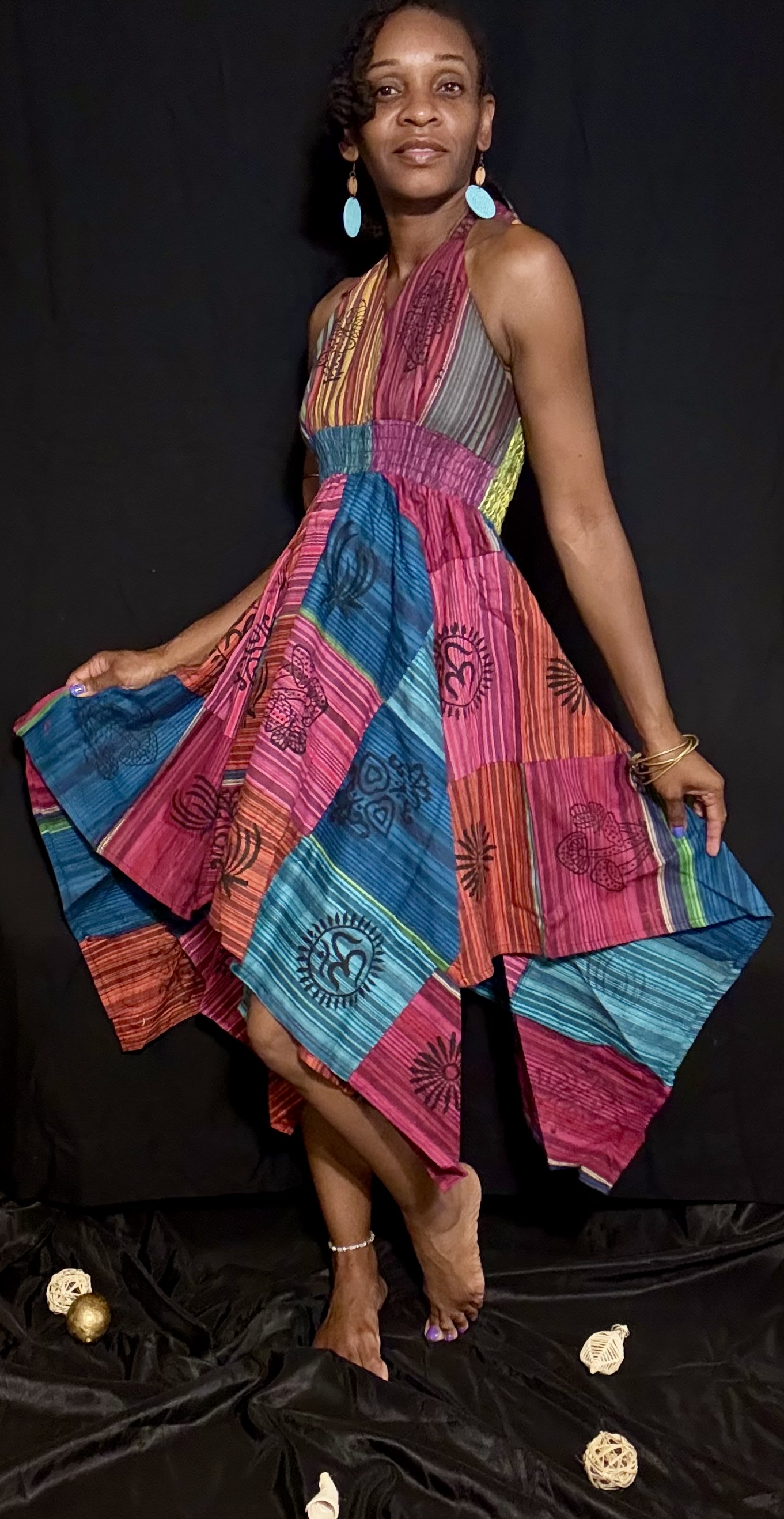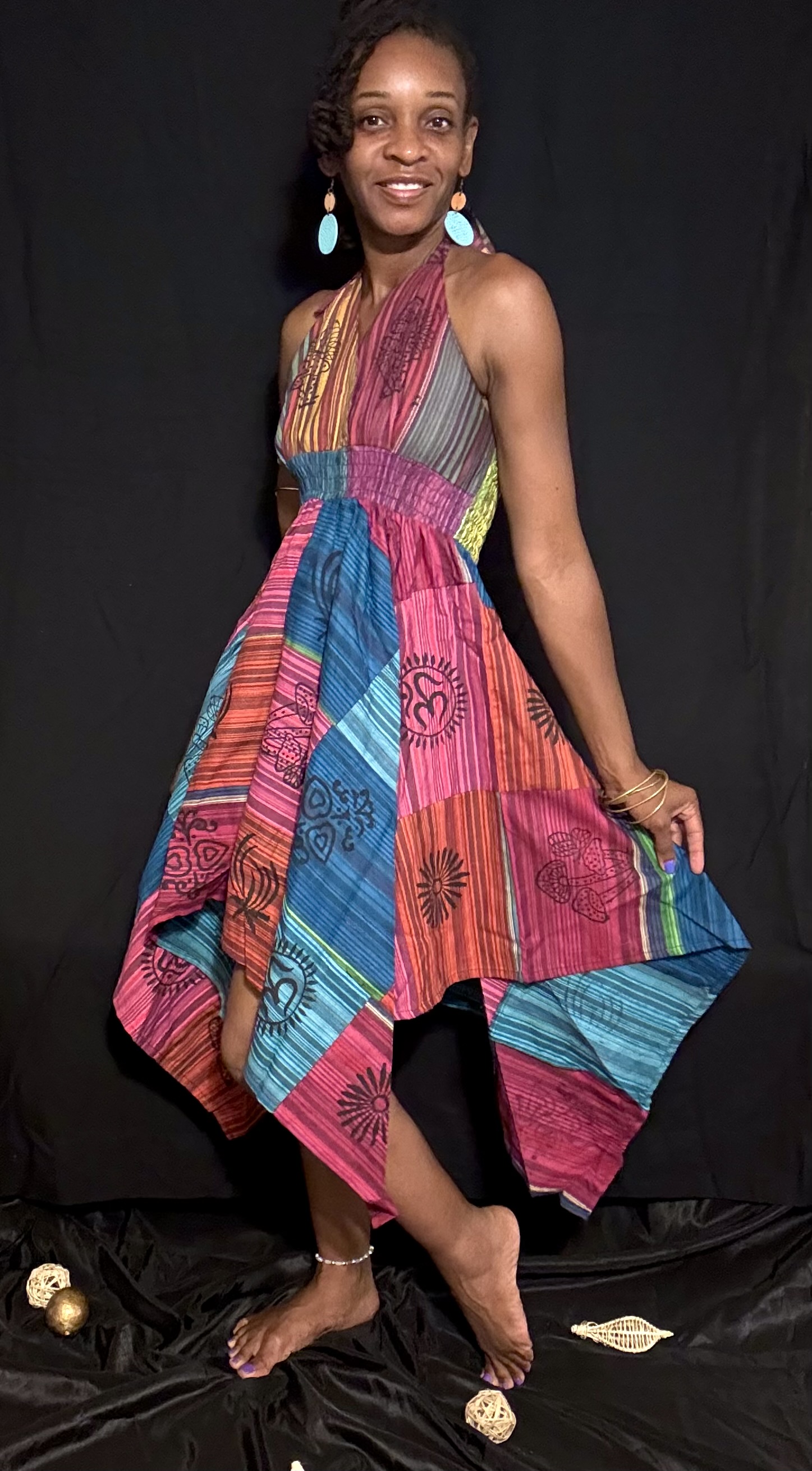 Make a statement with our stunning patchwork midi dress, featuring a unique blend of colorful fabrics and intricate designs. The sleeveless halter neckline adds a touch of elegance, while the pleated skirt creates a flowing, dynamic effect.