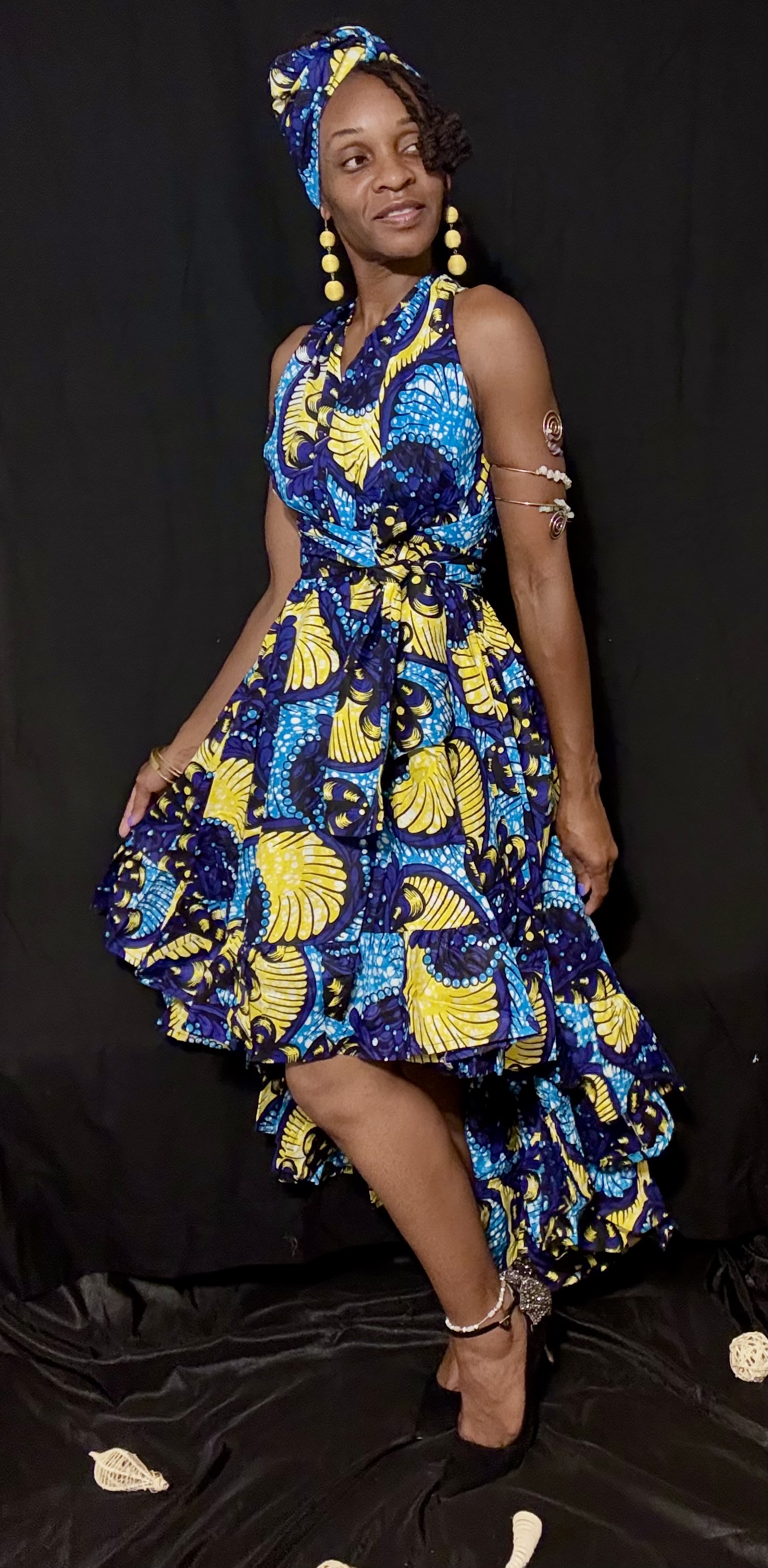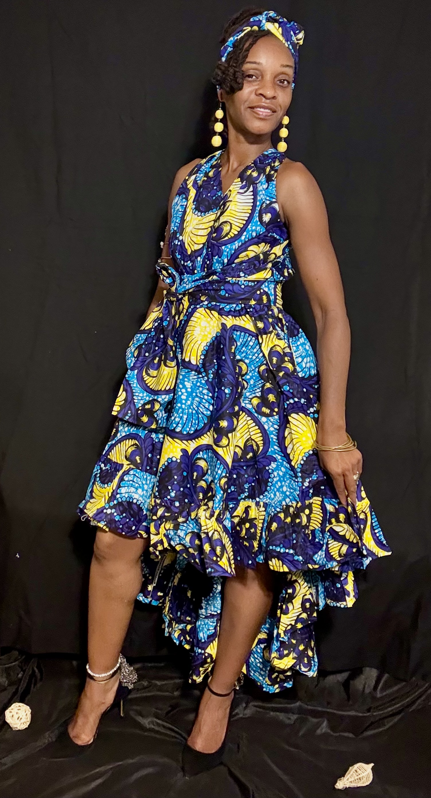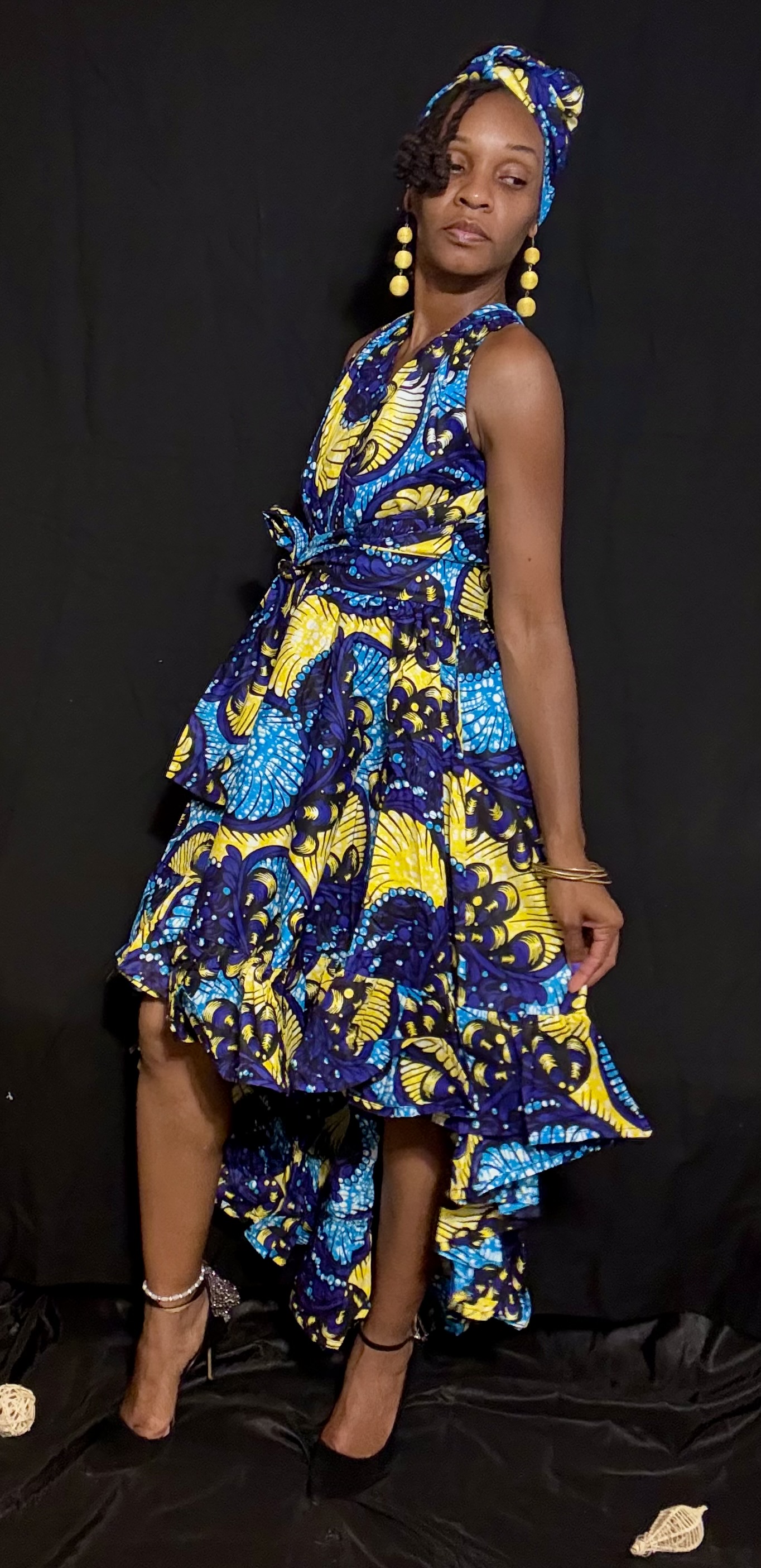 This exotic & vibrant halter dress with a high-low hemline features a striking blue and yellow African print pattern, which adds a pop of color to the overall design.