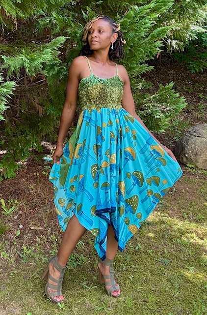 This vibrant piece features a smocked olive-green bodice paired with a dreamy, handkerchief-hem skirt in a stunning blue and green mushroom print. Perfect for sunny strolls, brunch dates, or outdoor festivals — this dress is where comfort meets captivating style. 💙💚
