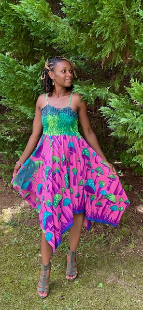 This vibrant piece features a smocked bodice paired with a dreamy, handkerchief-hem skirt in a mushroom print. Perfect for sunny strolls, brunch dates, or outdoor festivals — this dress is where comfort meets captivating style. 💙💚