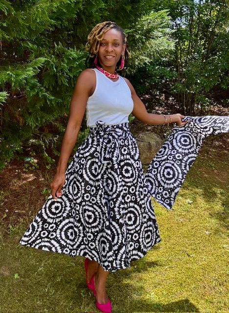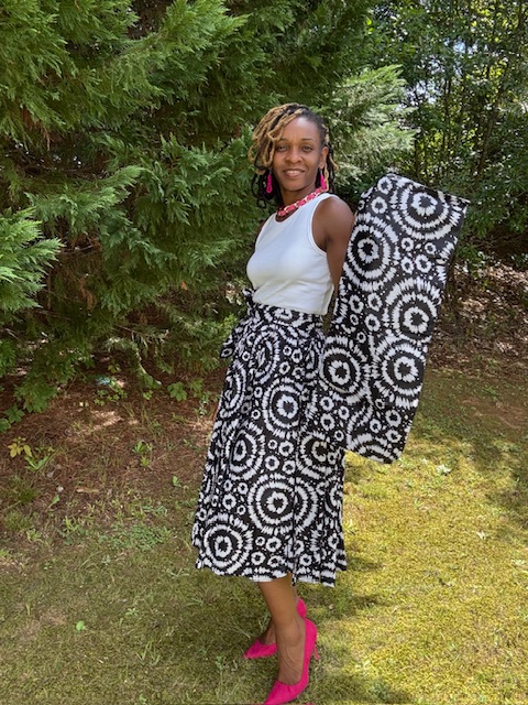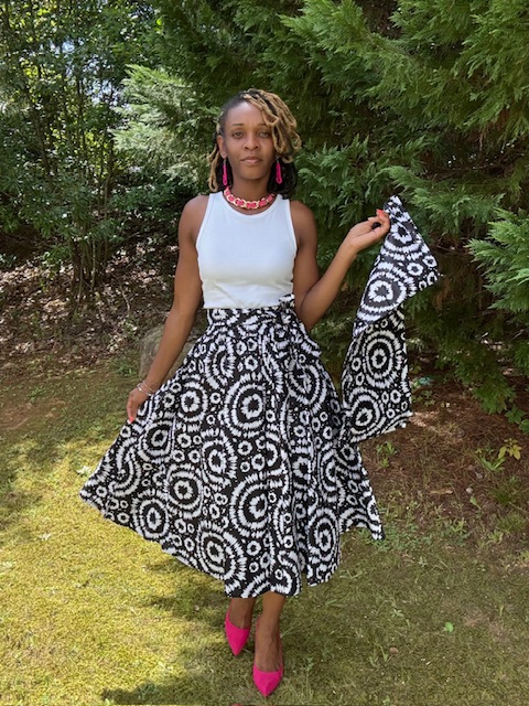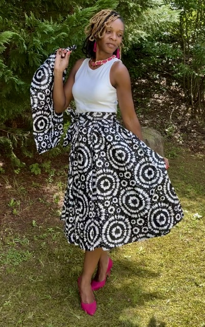 This outfit is a perfect blend of playful patterns and natural surroundings. The bold black and white patterned skirt with swirling designs pairs beautifully with a crisp white tank top, while the hot pink accessories add a pop of fun.