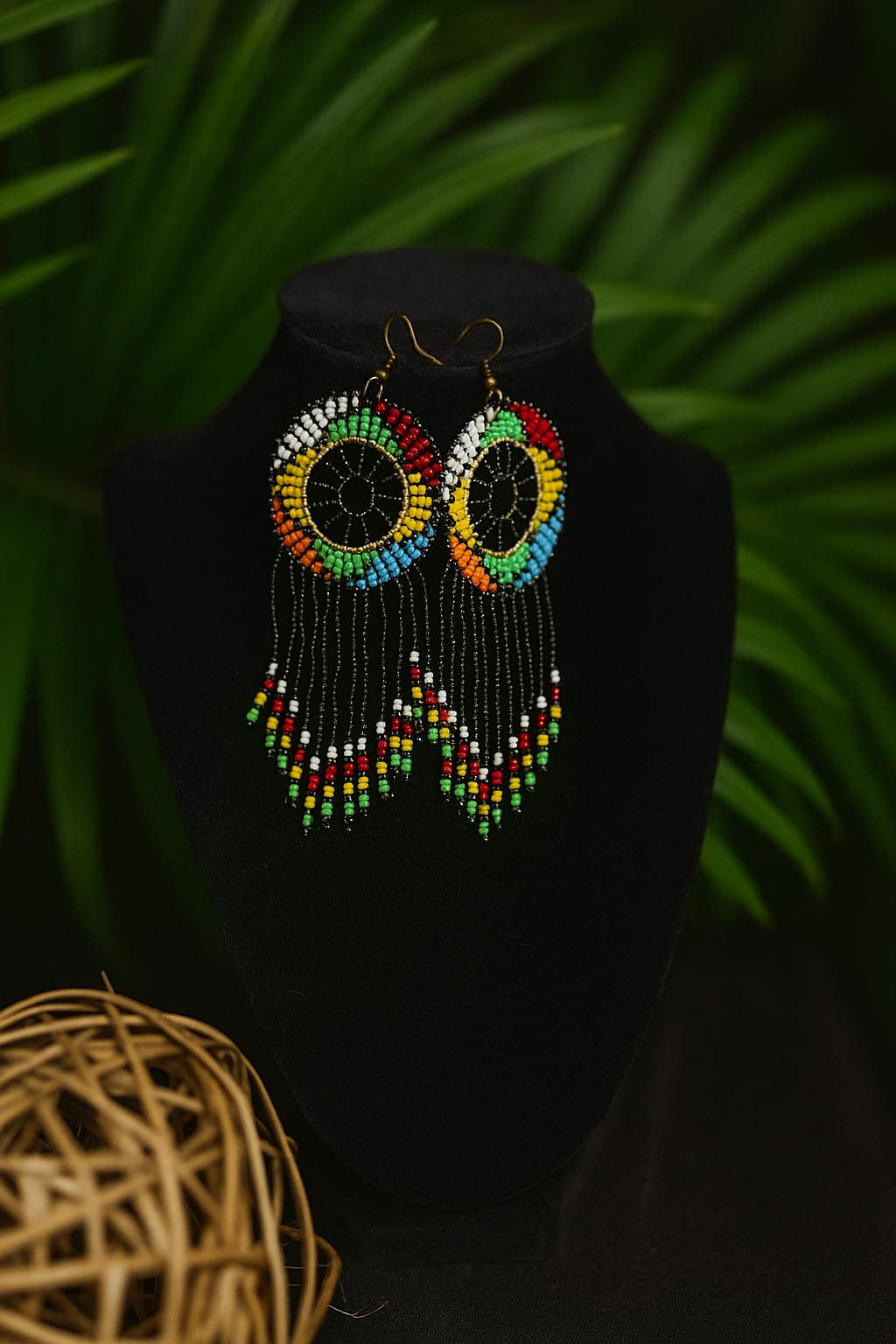 Illuminate your look with the Sunburst Harmony beaded earrings — a vibrant celebration of color, culture, and craftsmanship. Each pair features intricate beadwork radiating in bold hues of yellow, blue, green, red, and white, symbolizing unity and strength. The cascading fringe adds graceful movement with every turn.